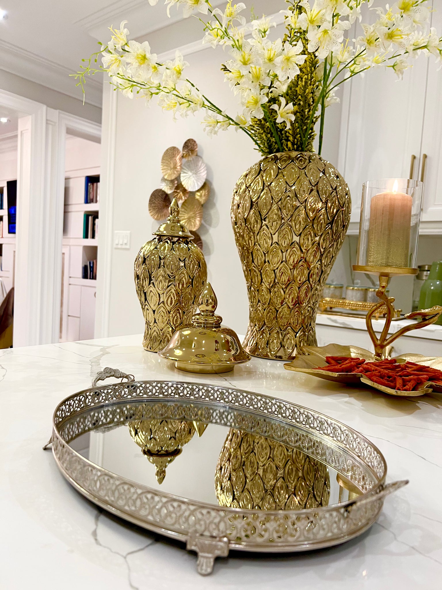 The gorgeous mirrored tray can be used for any thing, like using it just for decor, or serving tea, as a platter and more..